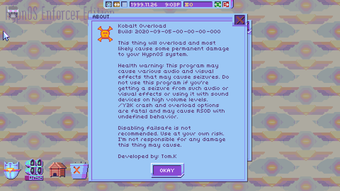 Kobalt Overload to modyfikacja stworzona dla gry Hypnospace Outlaw, która umożliwia graczom eksplorację ekstremalnych efektów audio i wizualnych. Program, dostępny na platformę Windows, jest darmowy i wprowadza unikalne doświadczenia, które mogą przeciążyć system HypnOS. Użytkownicy powinni zachować ostrożność, gdyż aplikacja może wywołać różnorodne efekty, które są potencjalnie niebezpieczne, zwłaszcza dla osób wrażliwych na bodźce wizualne i dźwiękowe.